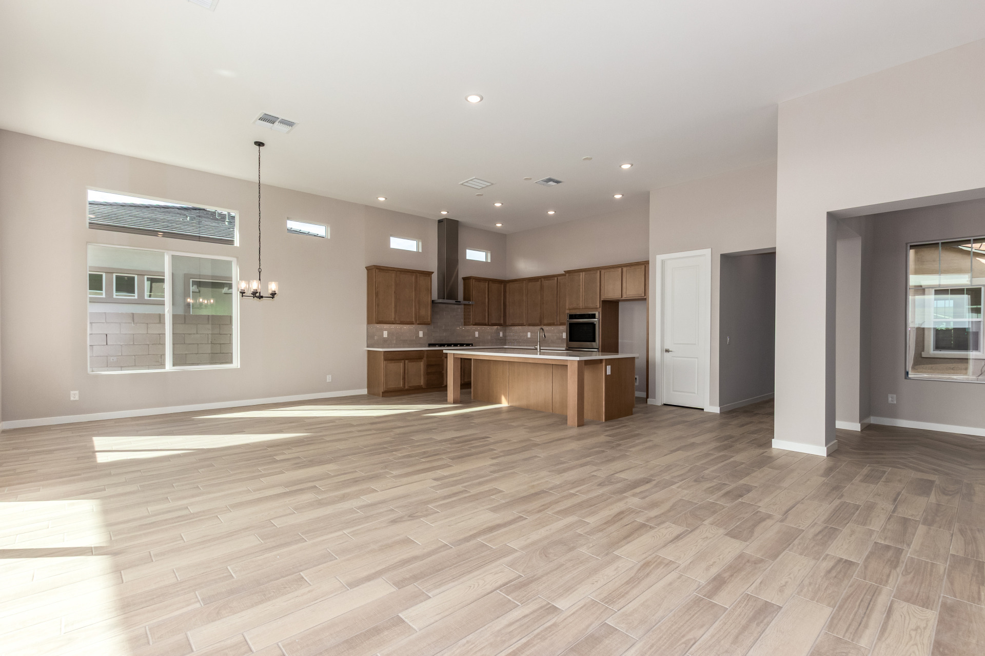 At the heart of the home, the expansive great room and gourmet kitchen flow beautifully together, highlighted by an oversized sliding glass door that opens to the large covered patio—perfect for indoor-outdoor entertaining. A centrally located powder bath and spacious laundry room enhance the home’s overall functionality.
