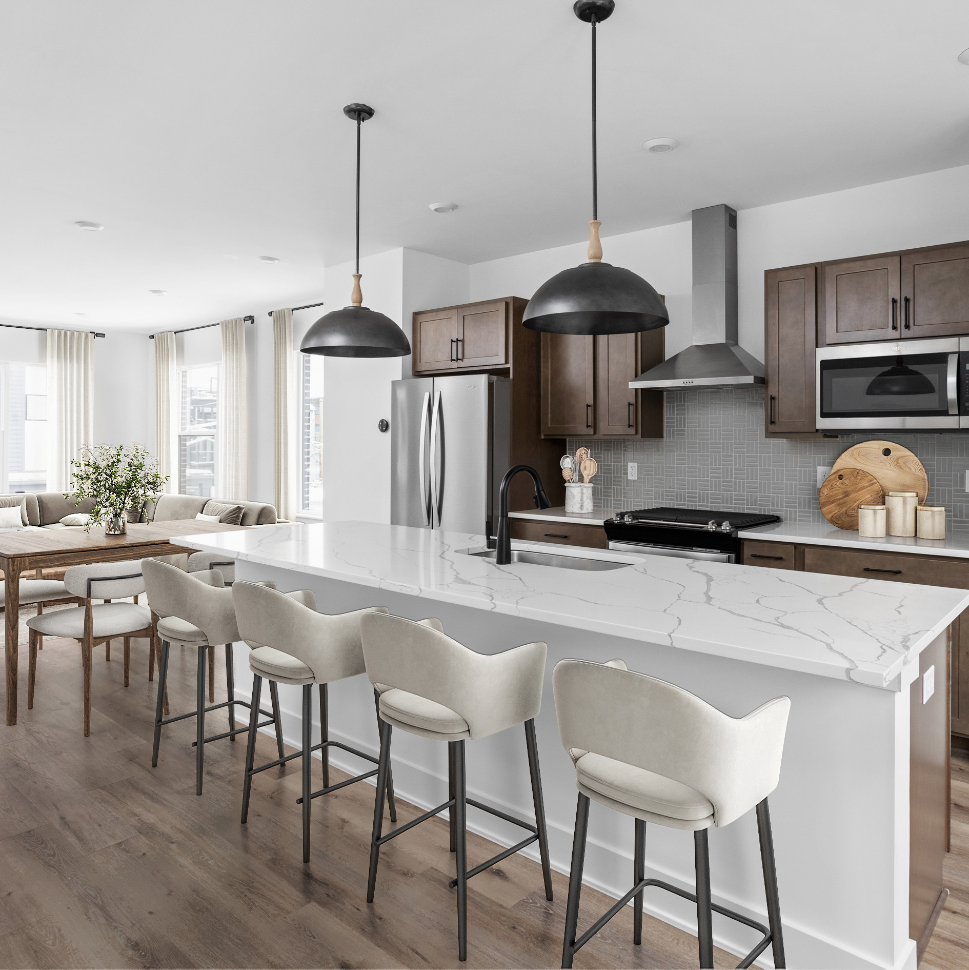 1317 Colere Pl. is a stylish 1,637 sq ft end-unit townhome offering low-maintenance city living just moments from Fountain Square’s hottest dining, nightlife, and entertainment. The open-concept main level features a modern kitchen with stainless steel appliances, a large quartz island, and spacious dining and living areas that flow to a private balcony. The first floor includes a welcoming entryway, access to the private two-car garage, and a flexible space ideal for a home office, gym, or lounge area. Upstairs, the third floor offers an inviting primary suite with a walk-in closet and double-sink vanity, an additional bedroom, a full bath, and convenient laundry on the same level as the main bedrooms. A built-in technology package completes the home with a video doorbell, smart front door lock, smart thermostat, and smart garage door opener.