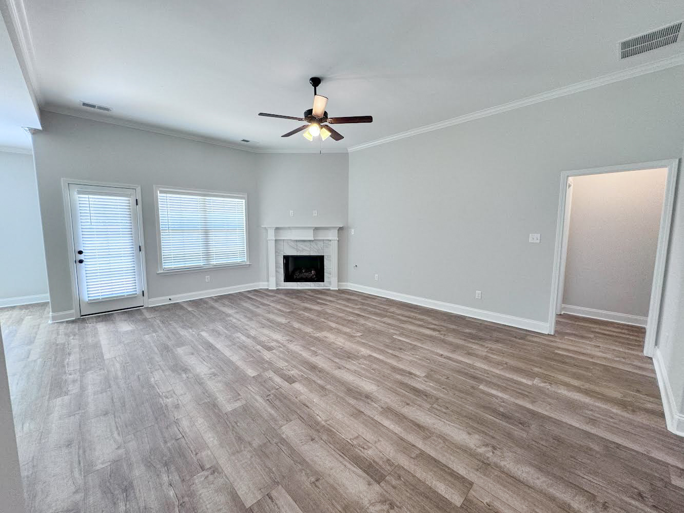 Spacious open concept floor plan with the family room containing gas log fireplace that looks into the kitchen and eating area. The kitchen has great cabinet space, granite countertops, and stainless-steel appliances. LVP floors flow from the foyer, family room, kitchen with eating area and hallways.