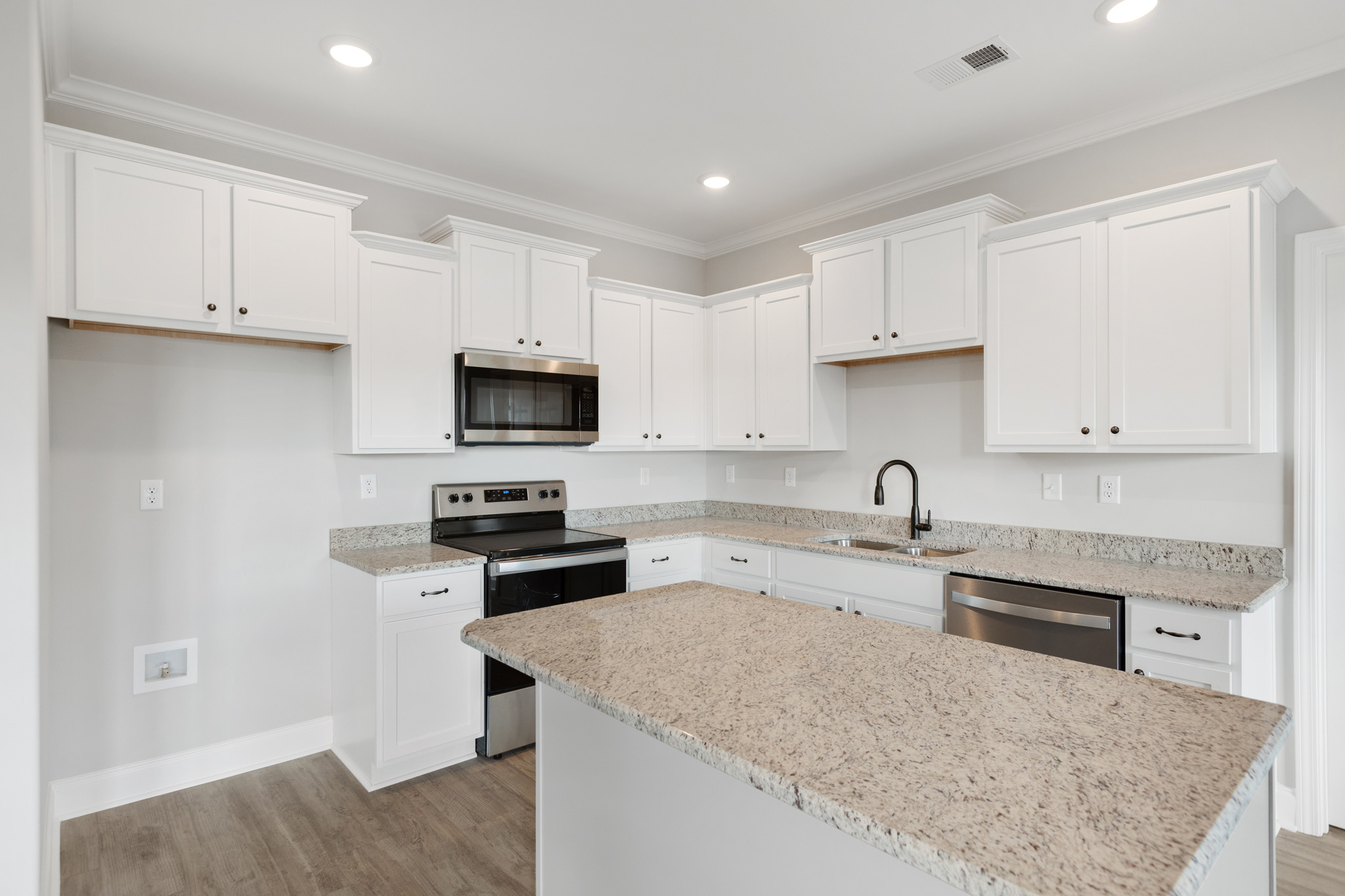 Spacious open concept floor plan with the family room containing gas log fireplace that looks into the kitchen and eating area. The kitchen has great cabinet space, granite countertops, and stainless-steel appliances. LVP floors flow from the foyer, family room, kitchen with eating area and hallways.