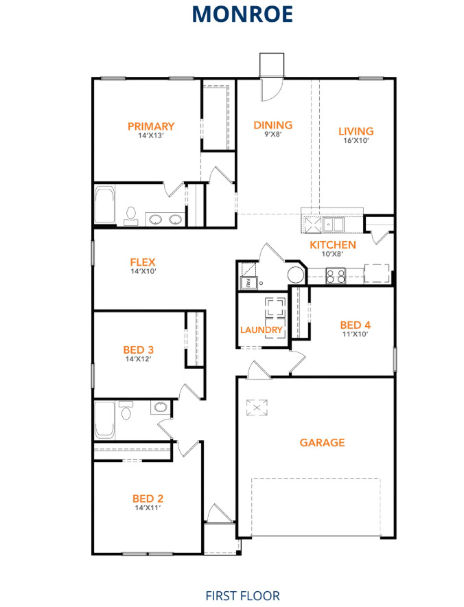 The Monroe Plan from our Liberty Series combines thoughtful design and everyday functionality, offering 4 bedrooms, 2 bathrooms, a 2-car garage, and 1,804 square feet of well-planned living space. This single-story home features a split-bedroom layout for added privacy. At the front of the home, you’ll find three secondary bedrooms, a full bathroom, and a conveniently located laundry room. A versatile flex room near the main living area offers the perfect space for a home office, playroom, or sitting area.