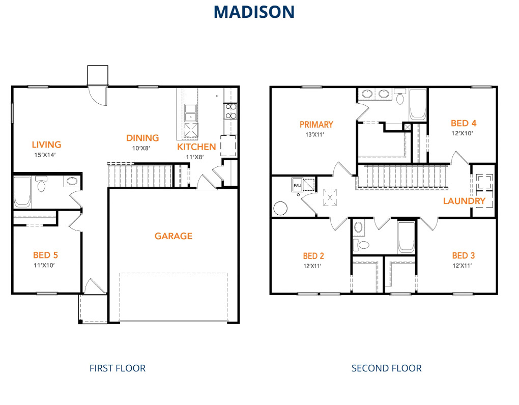 The Madison Plan from our Liberty Series combines style and functionality in a layout that maximizes space for your family’s needs. This 2-story home features 5 bedrooms, 3 bathrooms, a 2-car garage, and 1,804 square feet of well-designed living space.