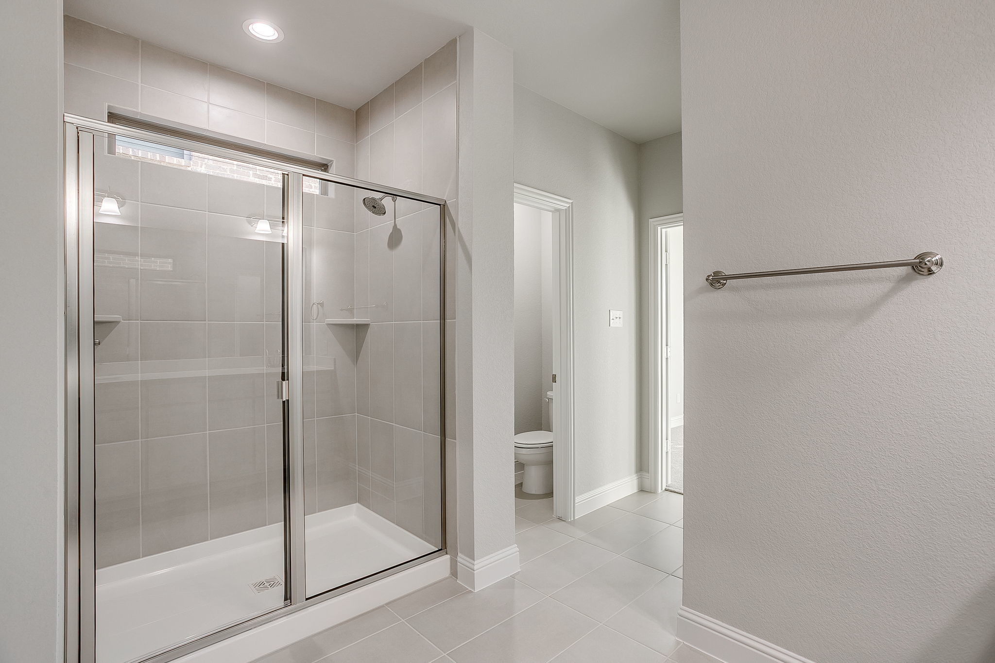 Tucked away on the first floor, the private primary suite serves as a tranquil retreat, complete with a dual vanity, elegant 12x24 tile accents, a large glass-enclosed shower, and a generous walk-in closet.