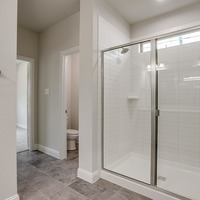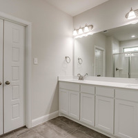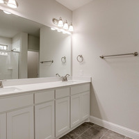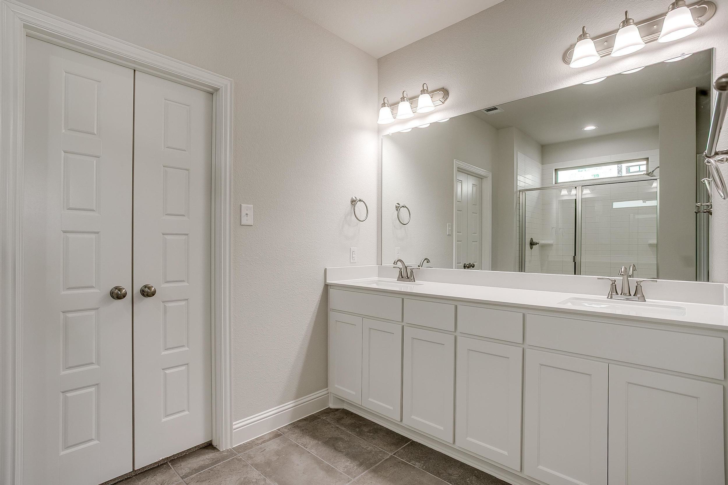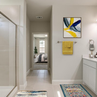 The private first-floor primary suite offers a peaceful escape, complete with a dual vanity, striking 12x24 tile detailing, a large glass-enclosed shower, and an expansive walk-in closet.