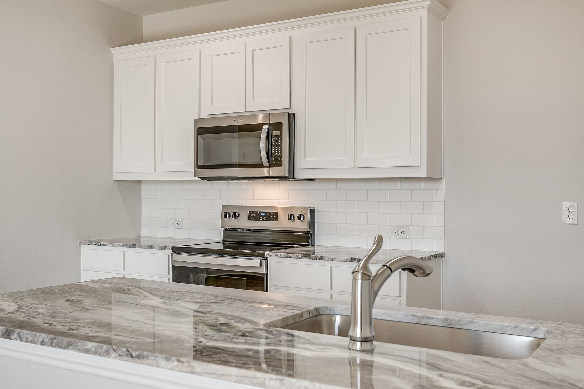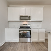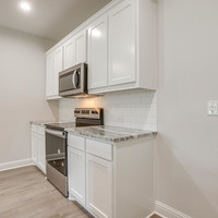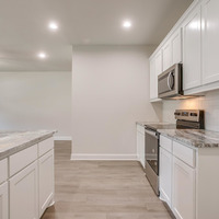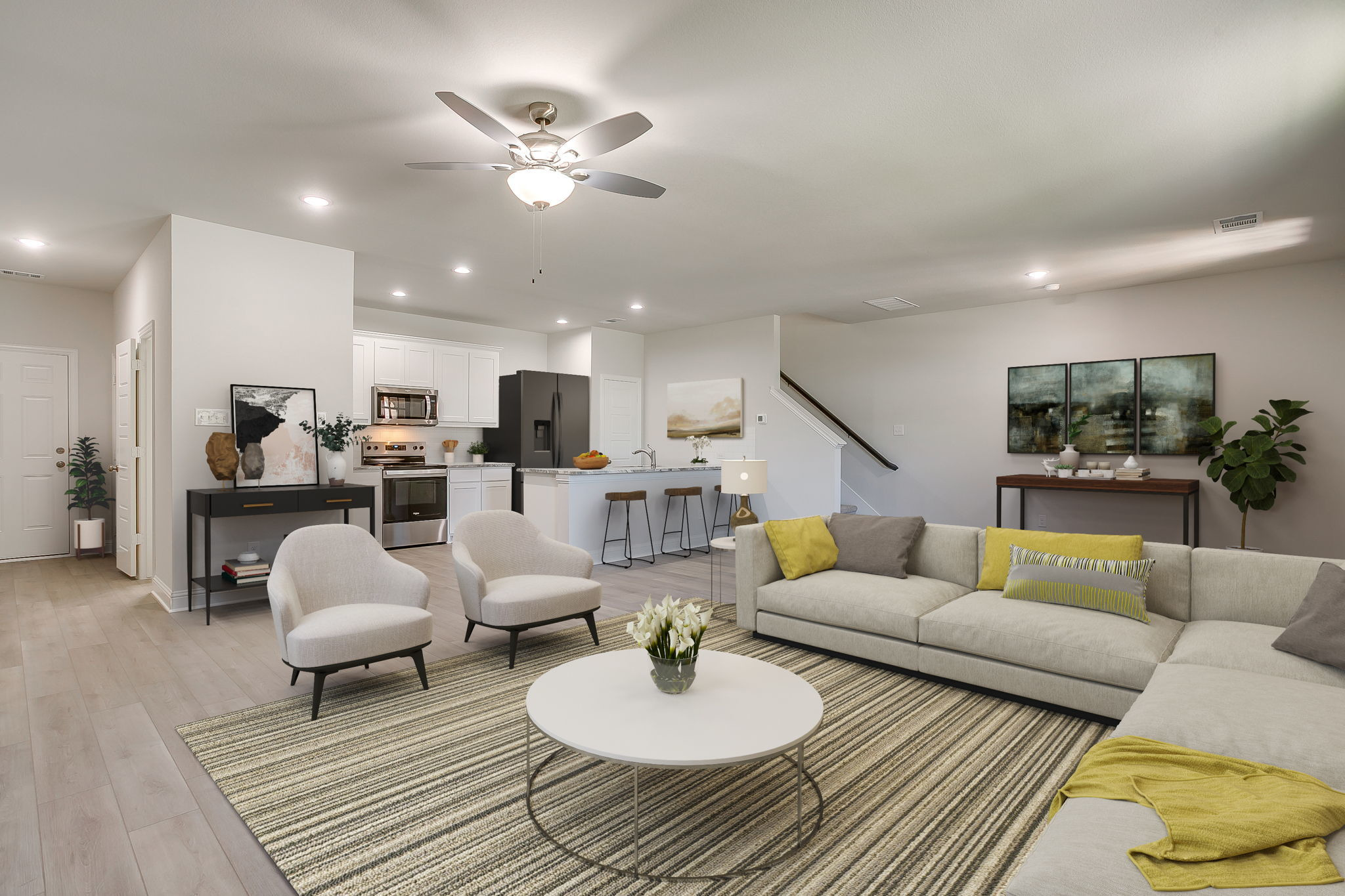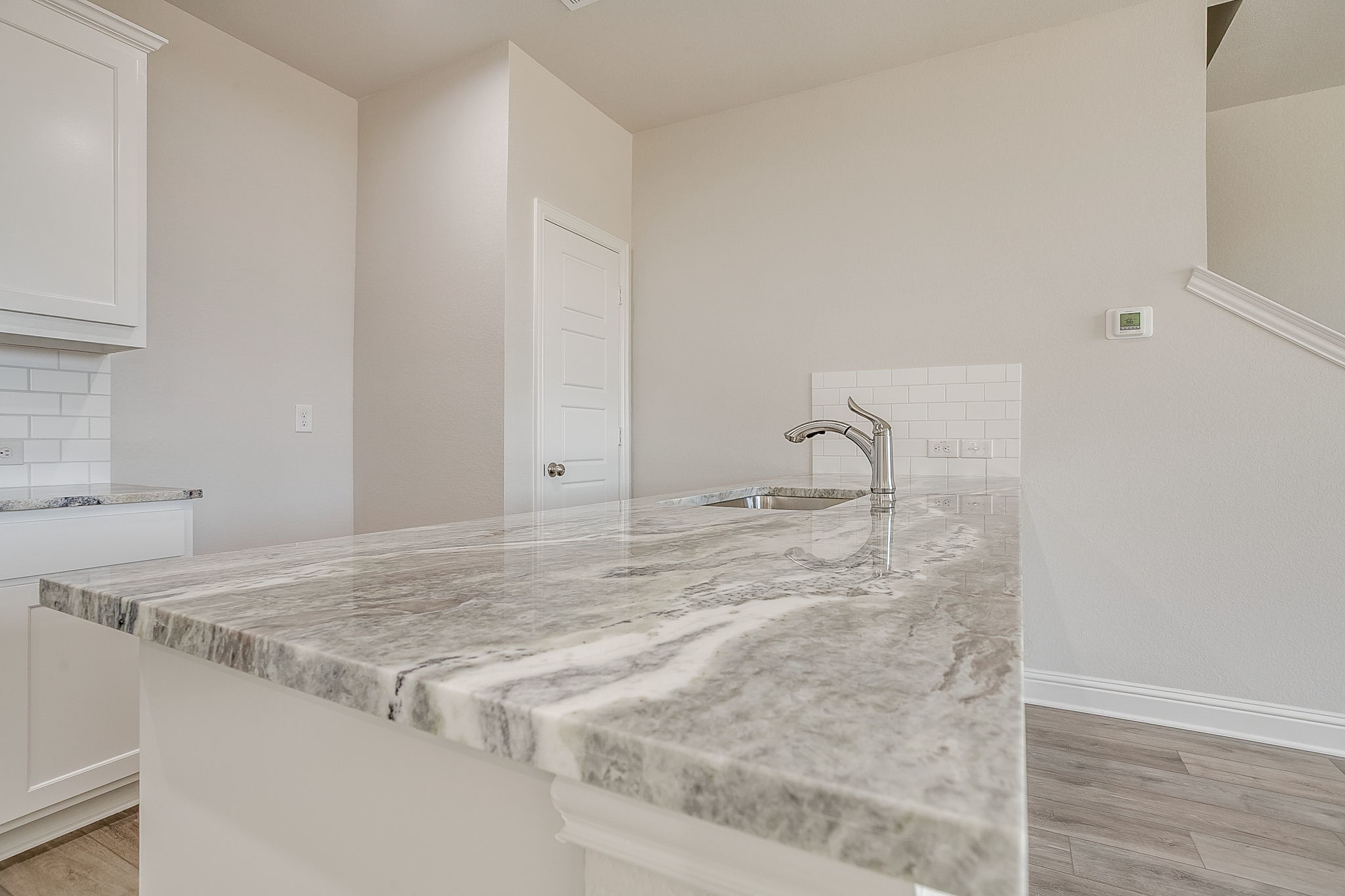 Inside, the main level unfolds in an open, entertainer-friendly layout finished with ultra-durable luxury vinyl plank flooring. Center stage is the chef-worthy kitchen—an inviting hub featuring an oversized island, stainless steel appliances, custom-painted cabinetry, a crisp subway-tile backsplash, gleaming quartz countertops, and a walk-in pantry for effortless storage. A stylish powder bath rounds out this level.