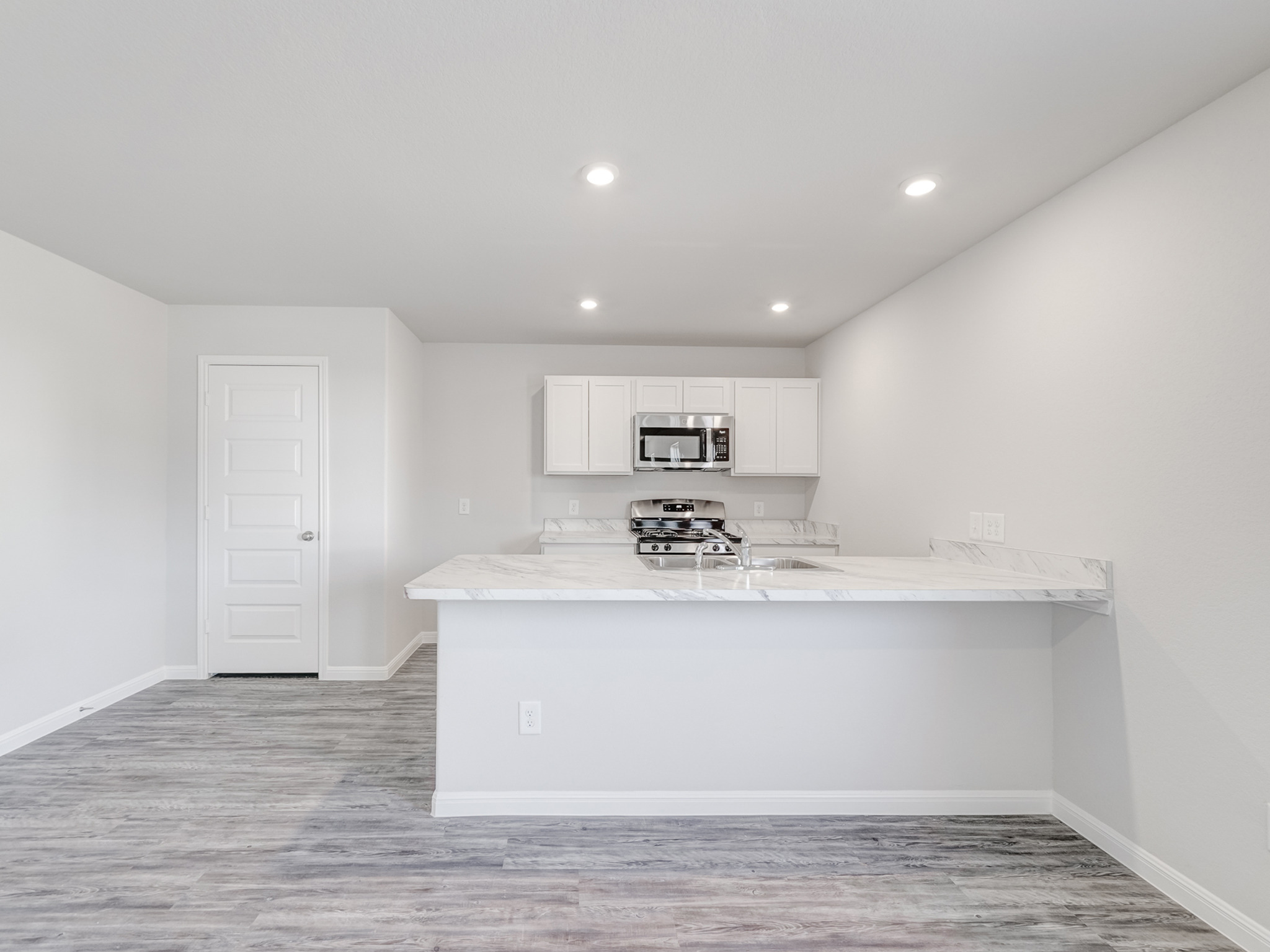 As you enter, you’ll find a main-level bedroom with a walk-in closet and a full bathroom — ideal for guests. Continue down the hall to the dining area, which sits perfectly between the well-appointed kitchen and the inviting family room, creating an ideal space for gathering and entertaining.