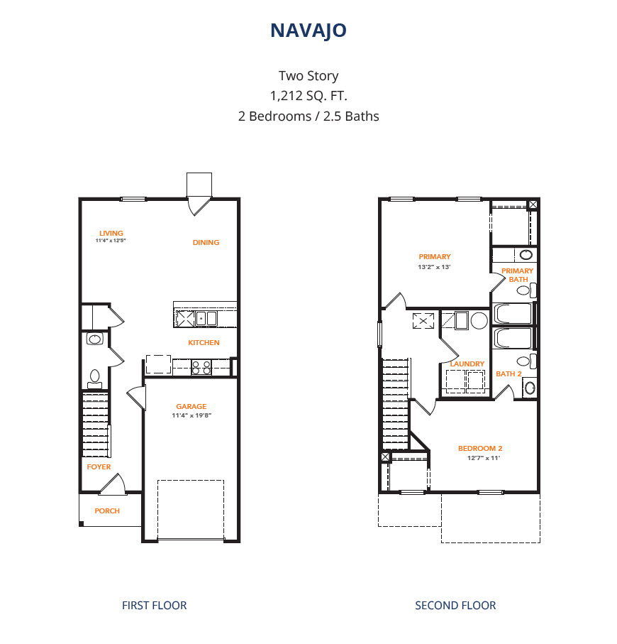 The Navajo Plan from our Celebration Series offers a thoughtfully designed two-story layout that blends open main-level living with private bedroom suites upstairs. With 2 bedrooms, 2.5 bathrooms, and 1,212 square feet of well-planned space, this home is ideal for buyers seeking comfort, efficiency, and modern design. The main level welcomes you with a covered front porch and foyer, leading into a hallway that opens to the kitchen, dining, and family room. The kitchen features an island with breakfast bar seating and generous counter space, opening to the dining and family room for easy everyday living. A patio door off the dining and living space provides access to outdoor enjoyment, while a convenient half bath completes the main level.