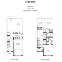 The Cherokee Plan from our Celebration Series offers a thoughtfully designed two-story layout that balances open main level living with well-separated private spaces upstairs. With 3 bedrooms, 2.5 bathrooms, and 1,417 square feet of well-planned living space, this home is designed for comfort, functionality, and everyday ease. The main level welcomes you with a covered front porch and foyer, leading into a hallway that opens to the kitchen, dining, and family room. The kitchen features an island with breakfast bar seating and generous counter space, opening naturally to the dining and family room for everyday living and entertaining. A patio door off the living area provides easy access to outdoor enjoyment, while a conveniently located half bath completes the main level.