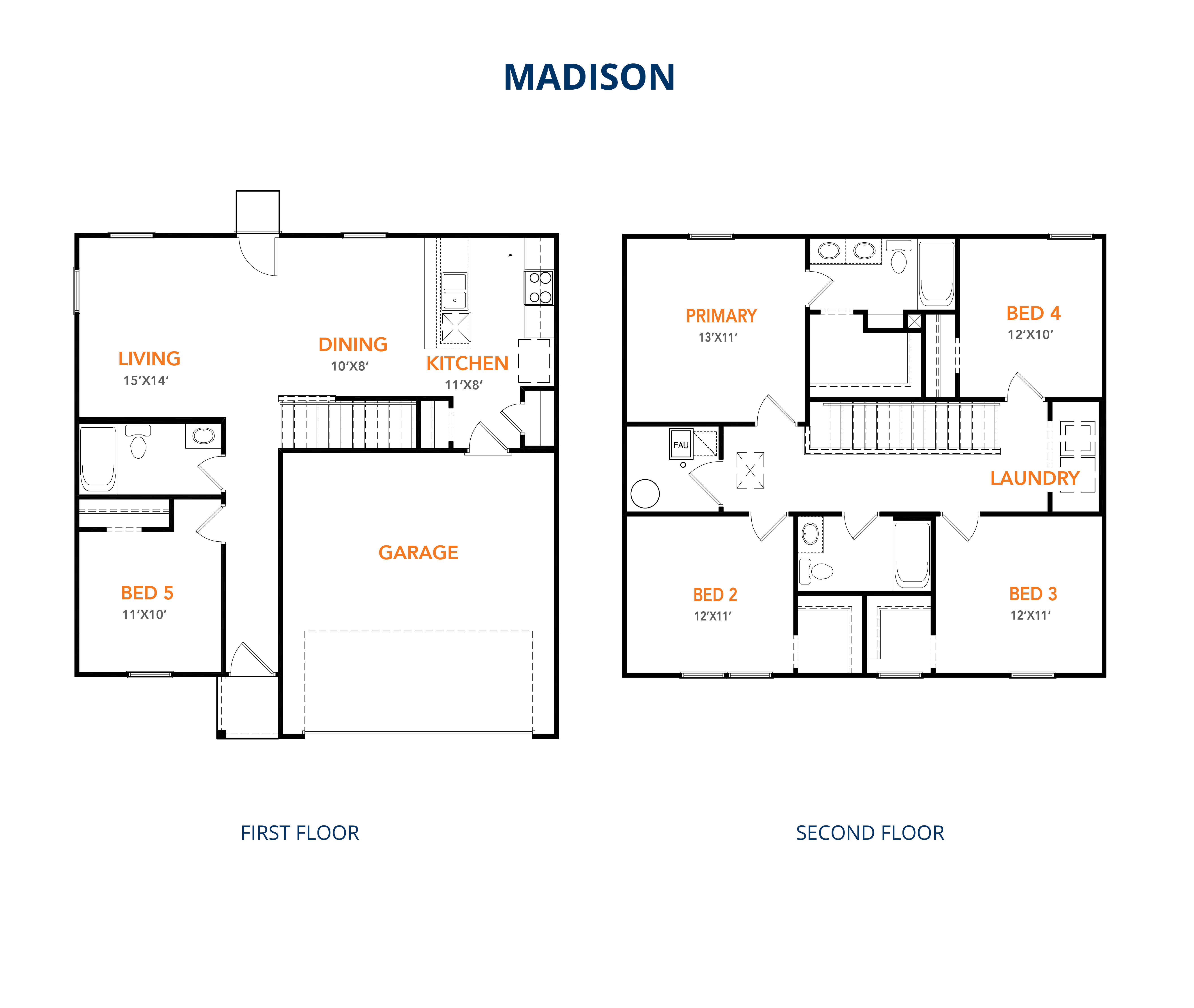 The Madison Plan from our Liberty Series combines style and functionality in a layout that maximizes space for your family’s needs. This 2-story home features 5 bedrooms, 3 bathrooms, a 2-car garage, and 1,804 square feet of well-designed living space.