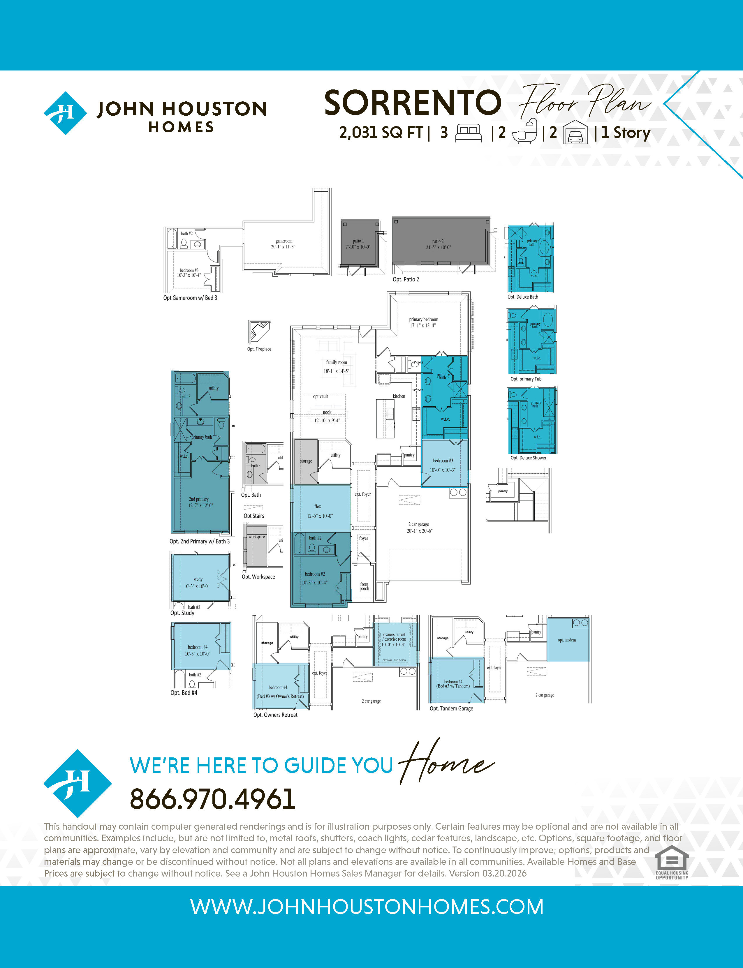 Introducing The Sorrento – our newest Flex Plan designed for modern living featuring 3 spacious bedrooms, 2 elegant bathrooms, and a welcoming extended foyer. The kitchen is a dream for entertaining, and the family room is sunkissed by natural light. Make it truly yours with options like a vaulted ceiling in the nook, an owner's retreat or exercise room, a second primary suite, a covered patio, charming fireplace, luxurious primary bath, workspace, game room, and more!