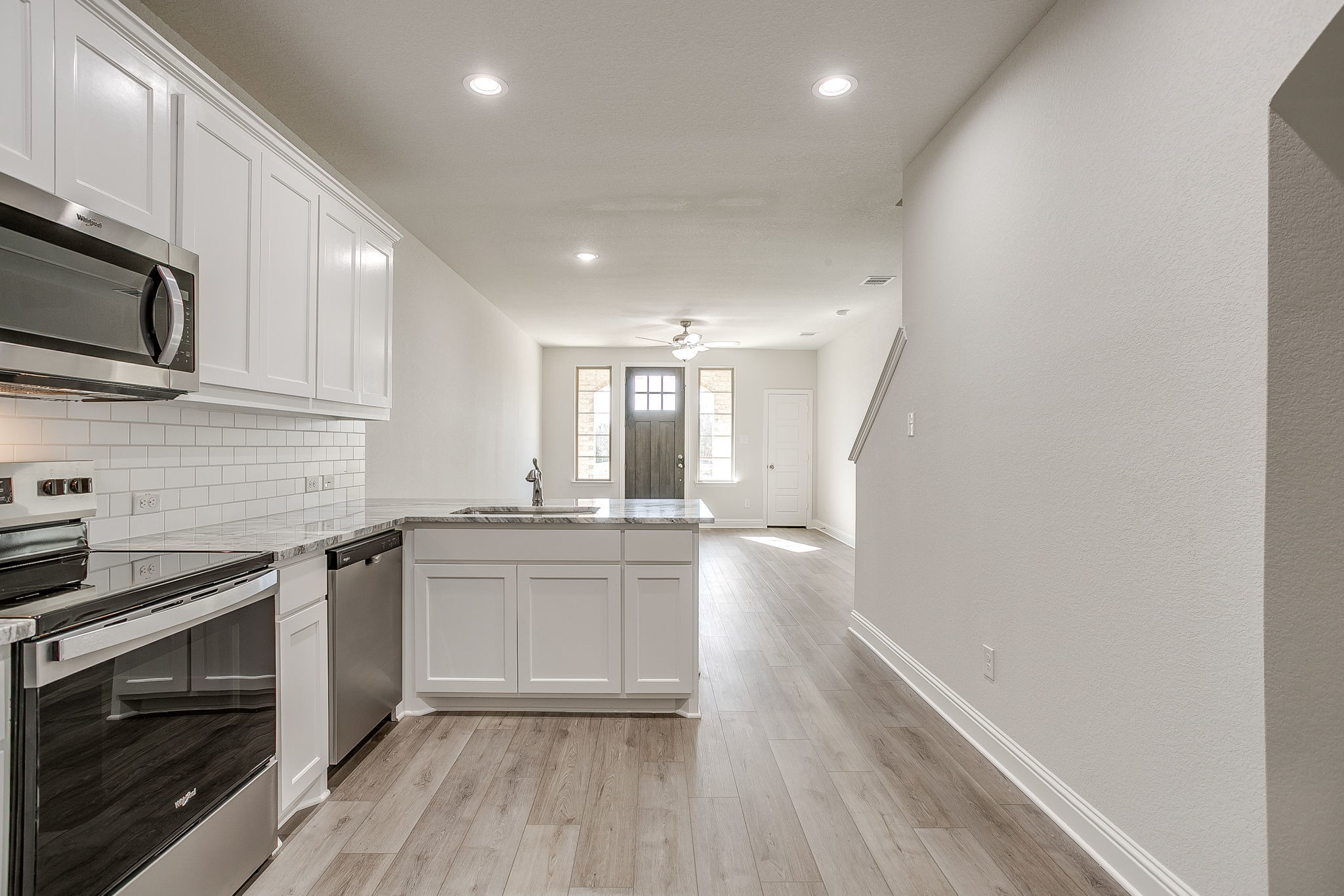 Inside, the open-concept main floor welcomes you with durable luxury vinyl plank flooring and a seamless flow between the living and dining areas—perfect for entertaining or unwinding. The gourmet kitchen is a true showstopper, featuring stainless steel appliances, custom-painted cabinets, a sleek subway tile backsplash, upgraded countertops, and a spacious pantry for effortless organization. A stylish powder bath adds convenience to the main level.