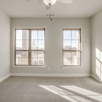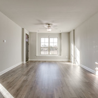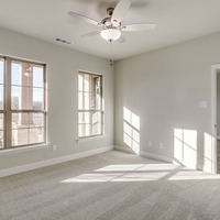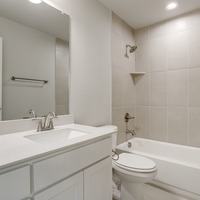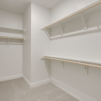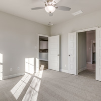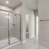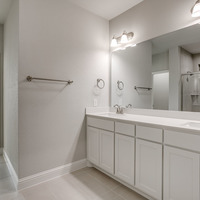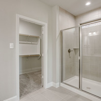 Tucked away on the first floor, the private primary suite serves as a tranquil retreat, complete with a dual vanity, elegant 12x24 tile accents, a large glass-enclosed shower, and a generous walk-in closet.